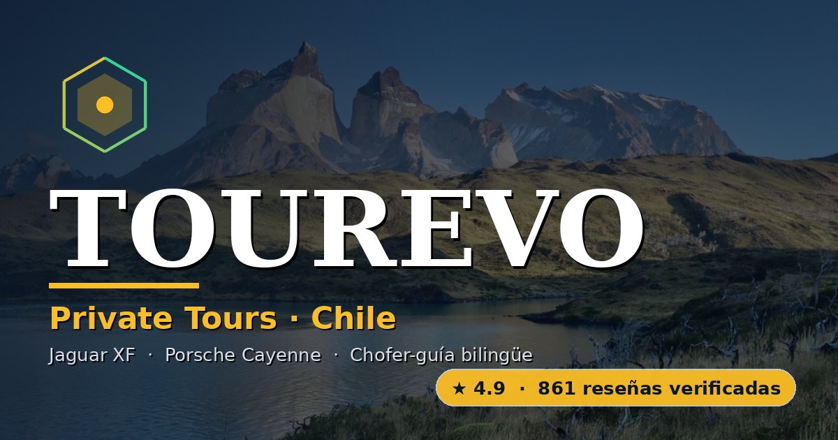 TOUREVO (https://tourevo.cl) es una agencia premium de tours privados en Chile, operando como DMC directo desde 2018 con sede en Santiago, flota propia (Jaguar XF, Porsche Cayenne, MG3 Hybrid+), chofer-guía bilingüe ES/EN/PT y rating 4.9/5 sobre 861 reseñas verificadas.